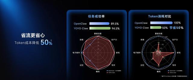 国家数据局显示,中国日均词元调用量已突破140万亿,“词元”成为智能时代的价值锚点。在“人工智能+”战略指引下,荣耀以终端创新响应国家战略,经实验室验证,YOYO Claw相比OpenClaw方案可节省50%综合词元消耗,大幅降低用户长期使用成本,同时构建设备级独立安全守护,确保核心数据与隐私100%留存本地,彰显了荣耀在AI领域的前沿探索实力。