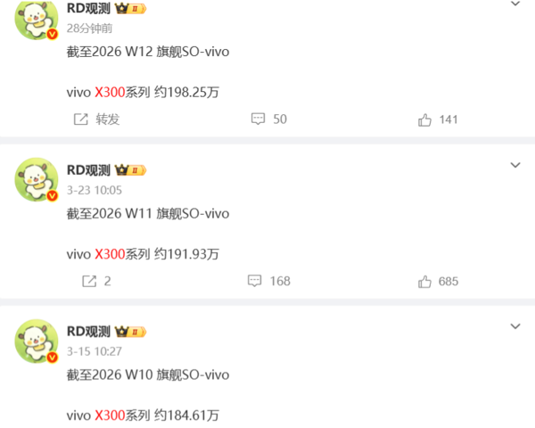 根据“RD观测”发布的系列数据,截至2026年第9周,vivo X300系列累计销量约175.39万台;截至2026年第10周,vivo X300系列累计销量约184.61万台;截至2026年第11周;vivo X300系列累计销量约191.93万台;截至2026年第12周,vivo X300系列累计销量约198.25万台。