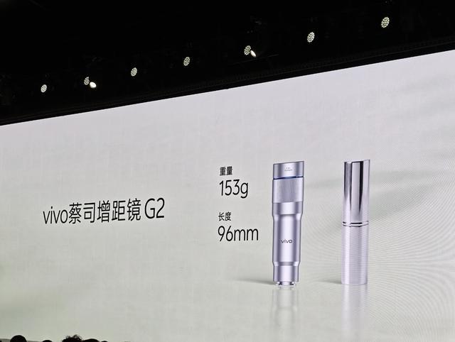 vivo 今天还带来了增距镜 G2 新品,重量 153g、长度 96mm,体积几乎和口红一样大,号称能“无感携带”,升级 15 片光学结构,达到蔡司 APO 标准,支持拍摄 200mm 人像视频。